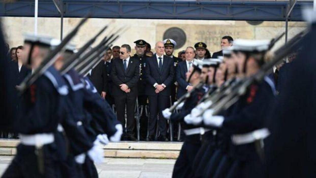 Yunanistan Deniz Kuvvetleri Astsubay Okulu'nun bir kısmının dün Atina'da gerçekleşen askeri geçit merasimi sırasında attığı…