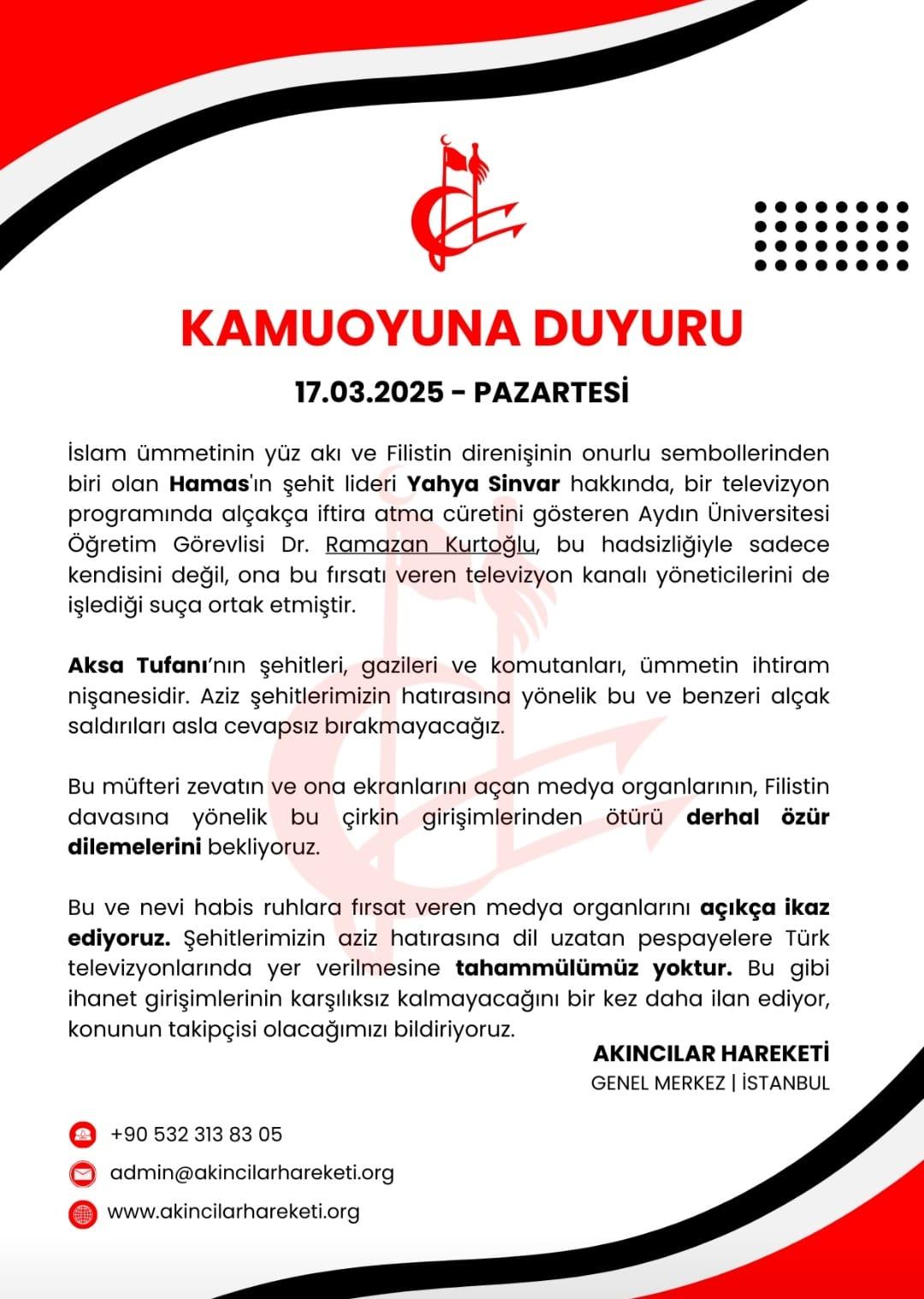 Akıncılar Hareketi, İsrail’in saldırısında şehit olan Hamas lideri Yahya Sinvar’ı hedef alan sözleri nedeniyle Dr. Ramazan Kurtoğlu’na sert tepki gösterdi. Akıncılar Hareketi’nden yapılan açıklama şöyle: