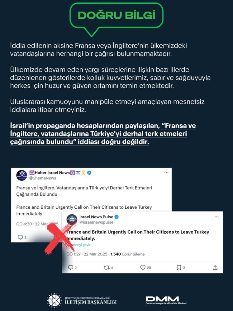 DMM’nin sosyal medya hesabından yapılan açıklamada, İsrail’in propaganda hesaplarından paylaşılan, “Fransa ve İngiltere, vatandaşlarına Türkiye’yi derhal terk etmeleri çağrısında bulundu” iddiasının doğru olmadığı belirtildi.