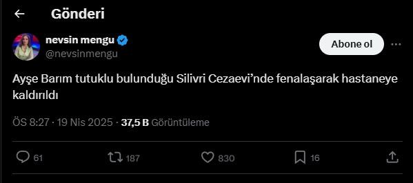 Gazeteci Nevşin Mengü, Barım’ın kötüleşerek hastaneye kaldırıldığını açıkladı. Mengü toplumsal medya hesabından yaptığı paylaşımda, “Ayşe Barım tutuklu bulunduğu Silivri Cezaevi’nde kötüleşerek hastaneye kaldırıldı” sözlerine yer verdi.